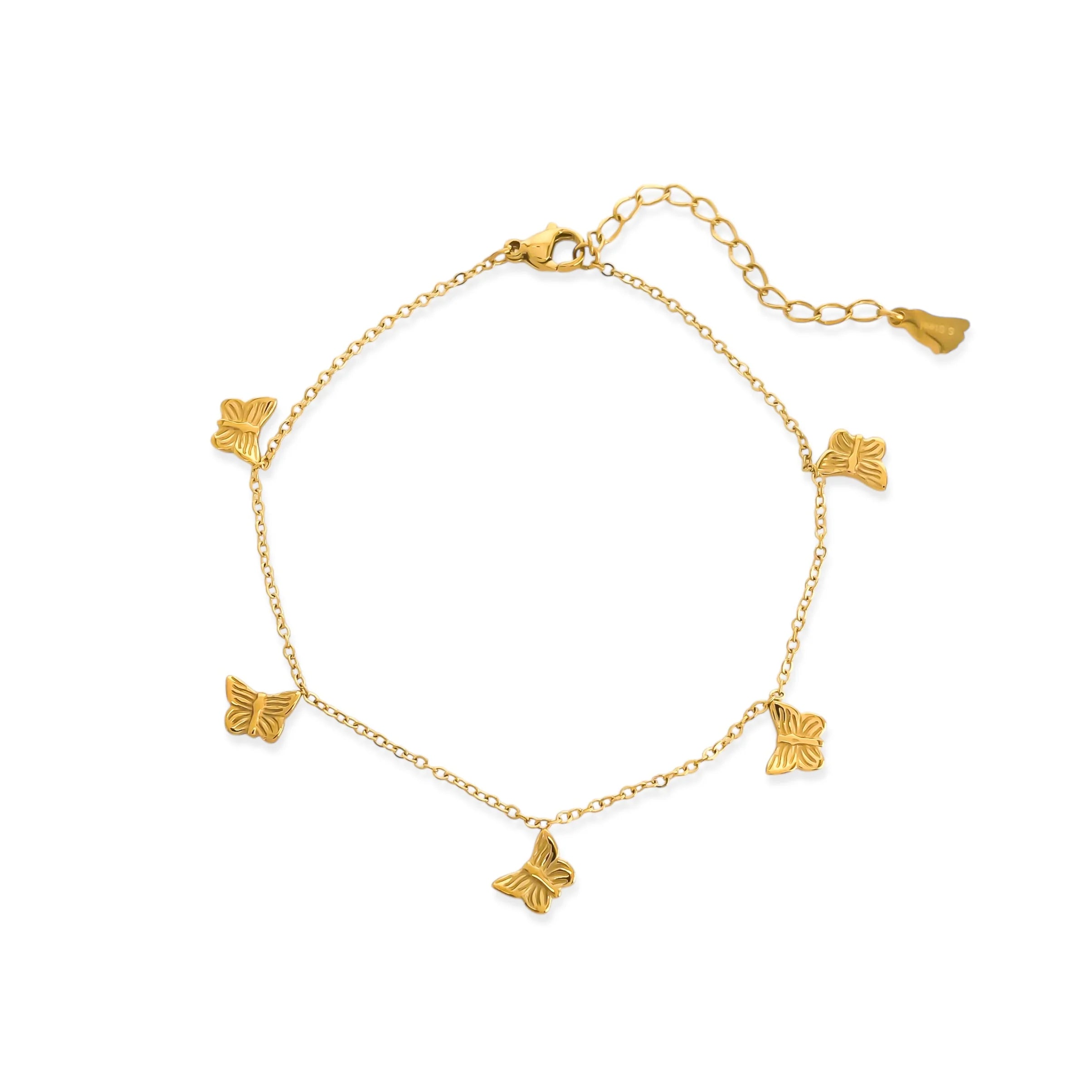 Embrace summer's playful spirit with this enchanting Butterfly Anklet. Five delicately crafted charms dangle along a luminous chain. Each butterfly station is perfectly spaced to create a harmonious flow that catches the light with every step, while the adjustable chain ensures your ideal fit!