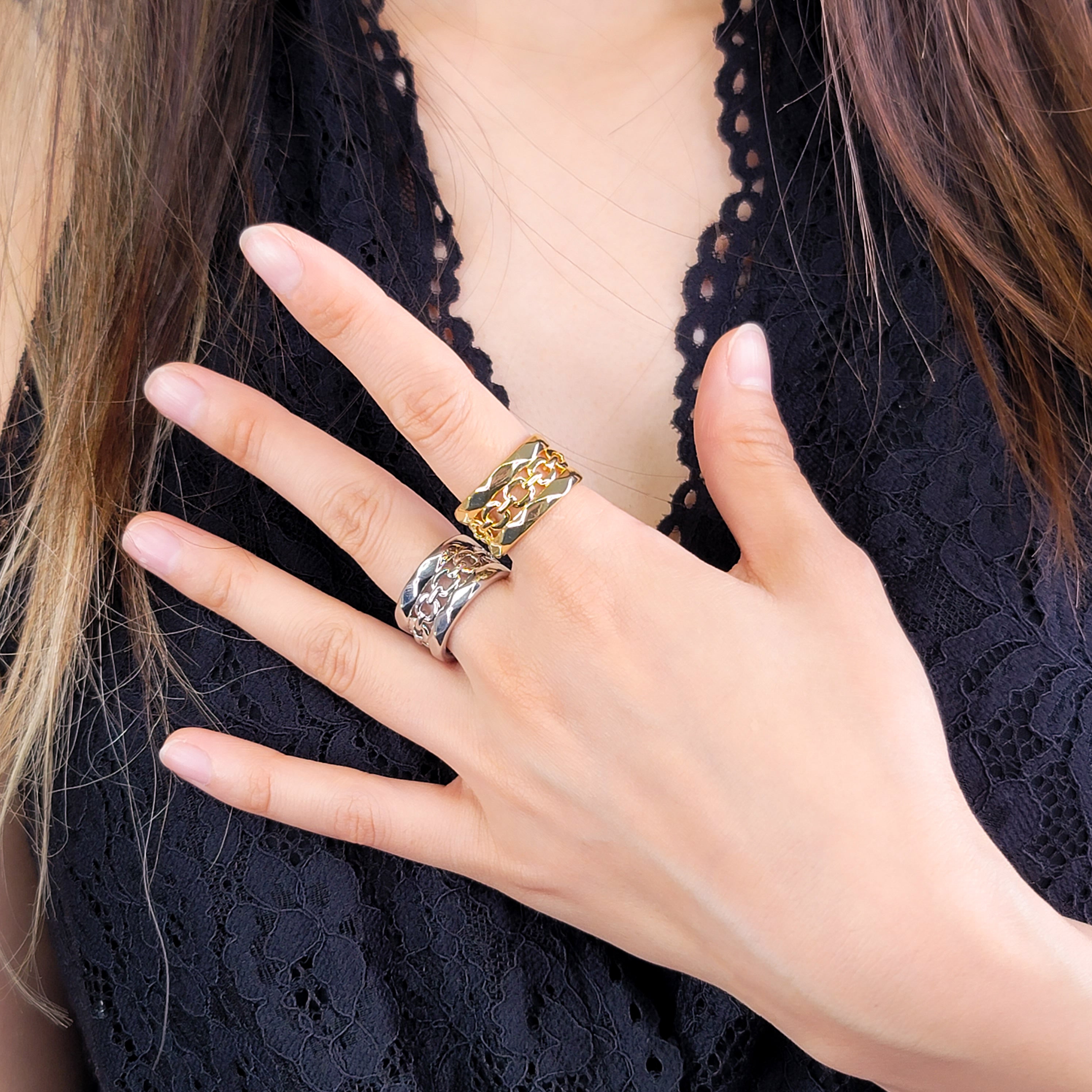 An exquisite gold plated ring featuring a paperclip chain in the center and framed by a diamond-patterned layer of stones. The intricate design adds a sense of modern elegance.