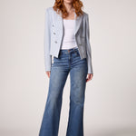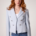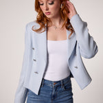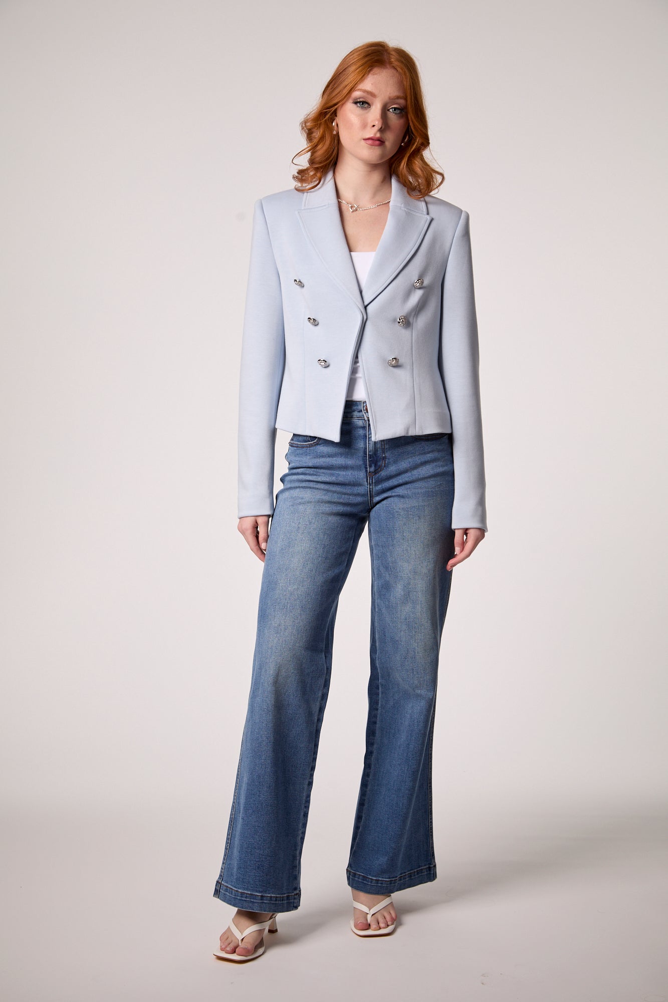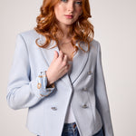Tailored to turn heads, the Charlotte Blazer pairs a soft baby blue hue with statement silver buttons and a secret lining you’ll want to flaunt!