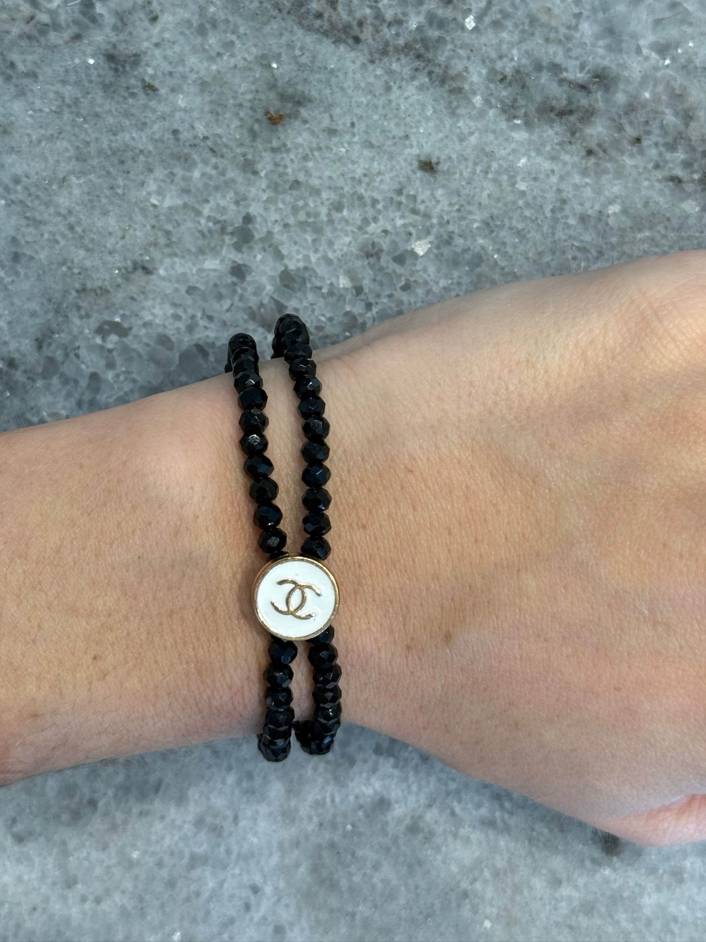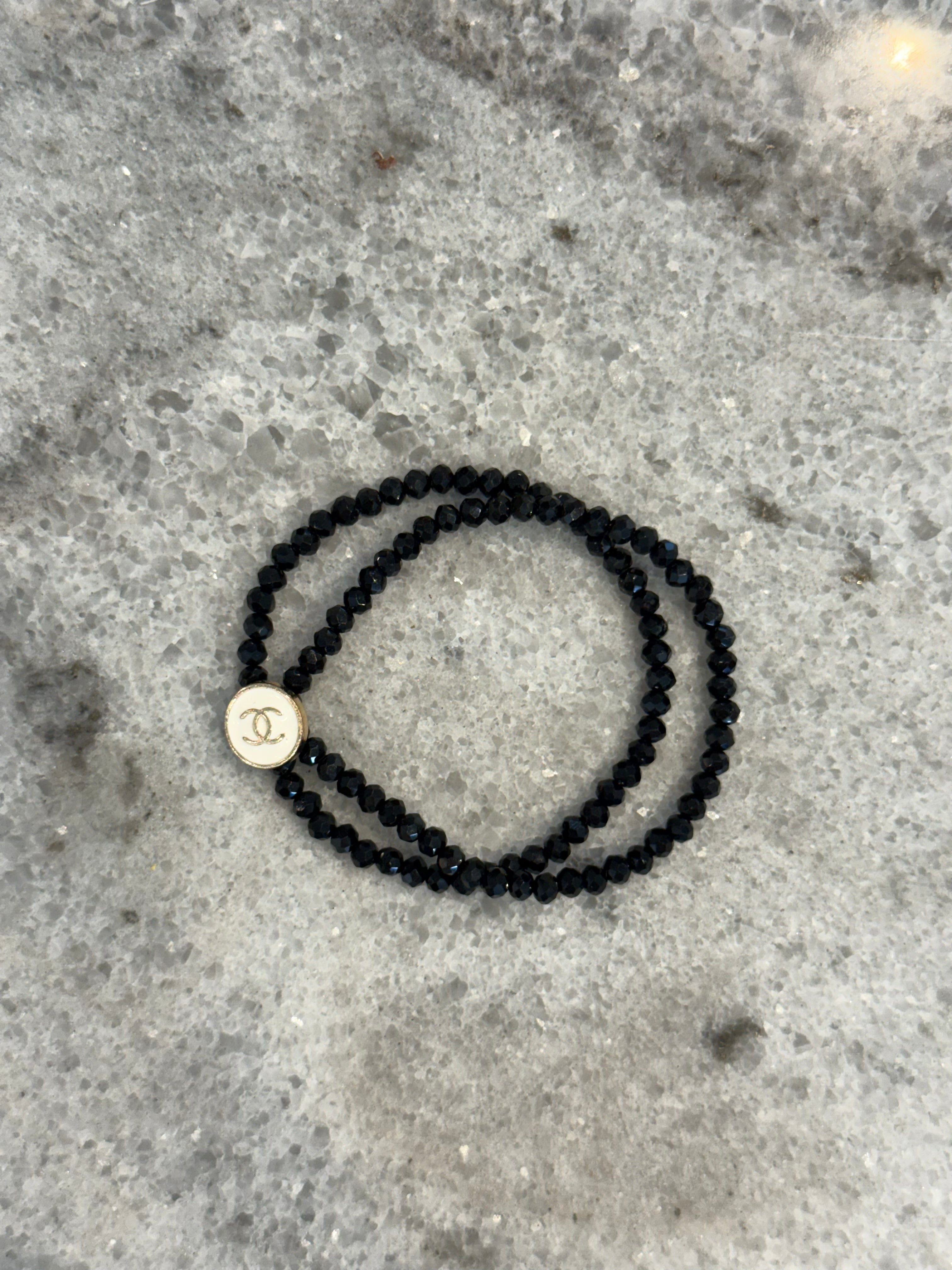 Up your fashion game with this stunning vintage button bracelet! Two strands of faceted crystal are strung on elastic and are attached together with a vintage button to create this special piece.