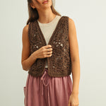 Lightweight crochet vest with an open-weave design. Perfect for layering over tees or dresses. Breathable, comfortable, and effortlessly stylish.
