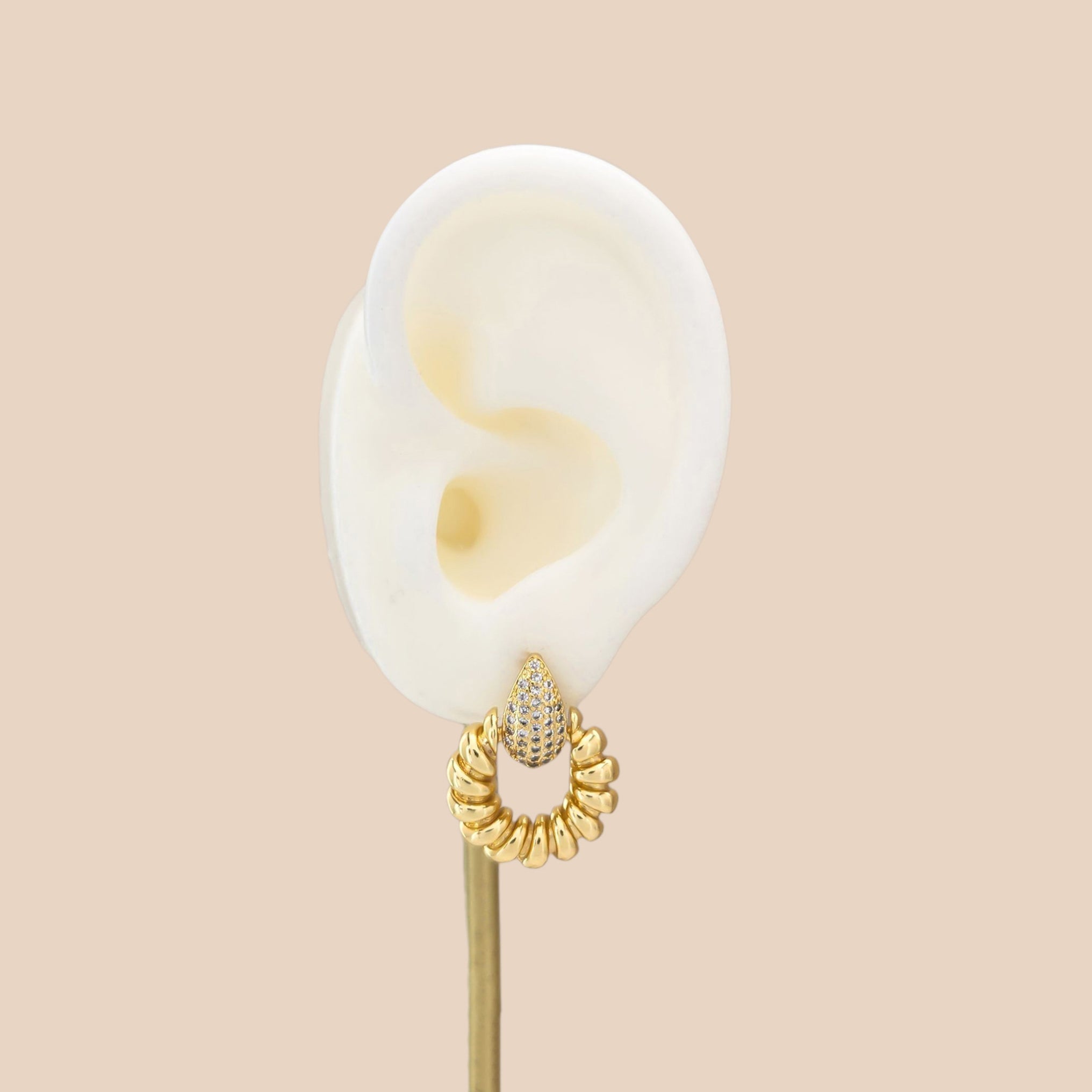 These sculptural earrings feature a bold circular form crafted from gleaming gold segments, topped with a cubic zirconia teardrop. With a geometric form that fuses contemporary sharpness and luxurious accents, these earrings serve as a striking accessory.