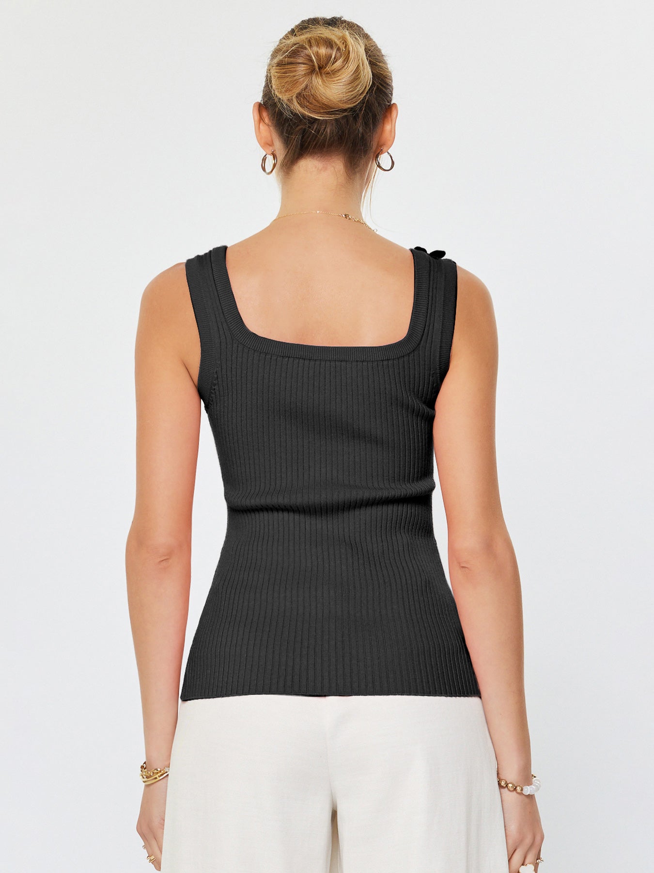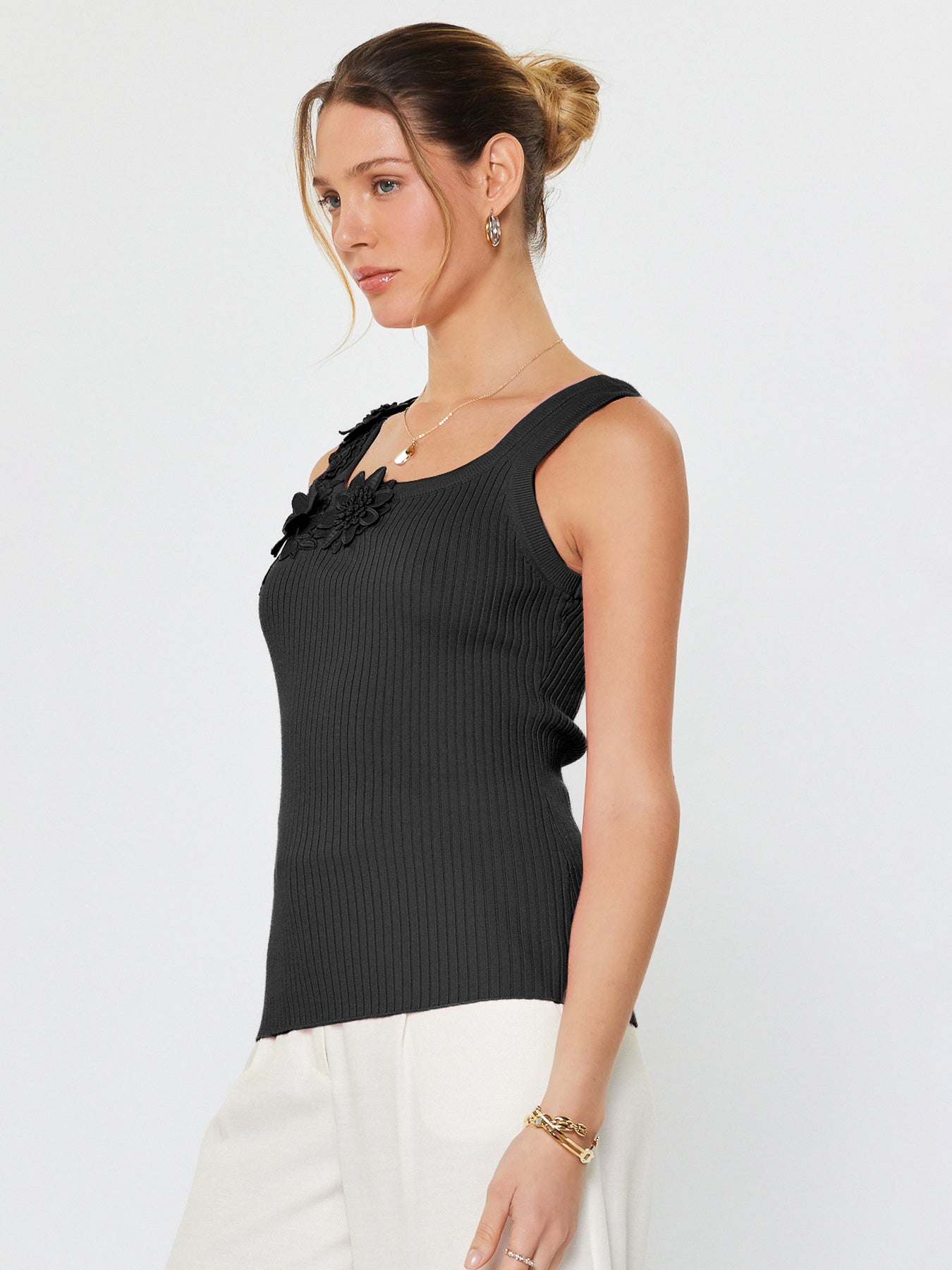 Elevate your warm-weather wardrobe with this charming knit tank top. The square neckline offers a modern, flattering silhouette, while delicate floral appliqués add a touch of feminine detail! Perfect for an everyday outfit!