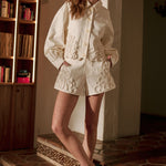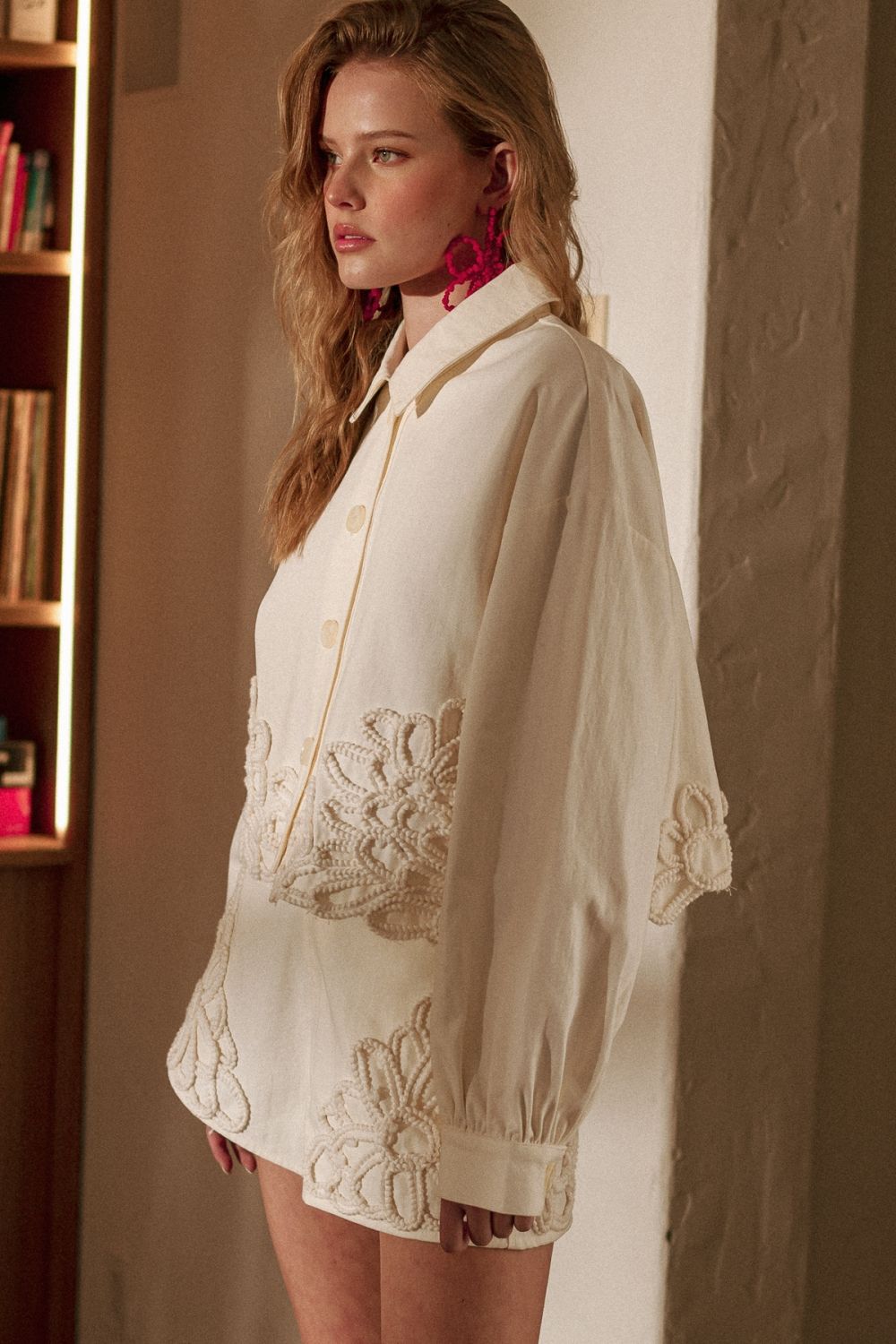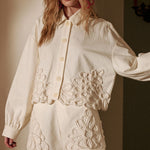 Elevate your wardrobe with this stunning Floral Detail Jacket—a versatile piece that brings effortless elegance to any outfit. The intricate floral embellishments add a touch of sophistication and charm, making it perfect for layering over dresses, tees, or tanks. Pair it with our matching shorts for a coordinated, polished look that turns heads!