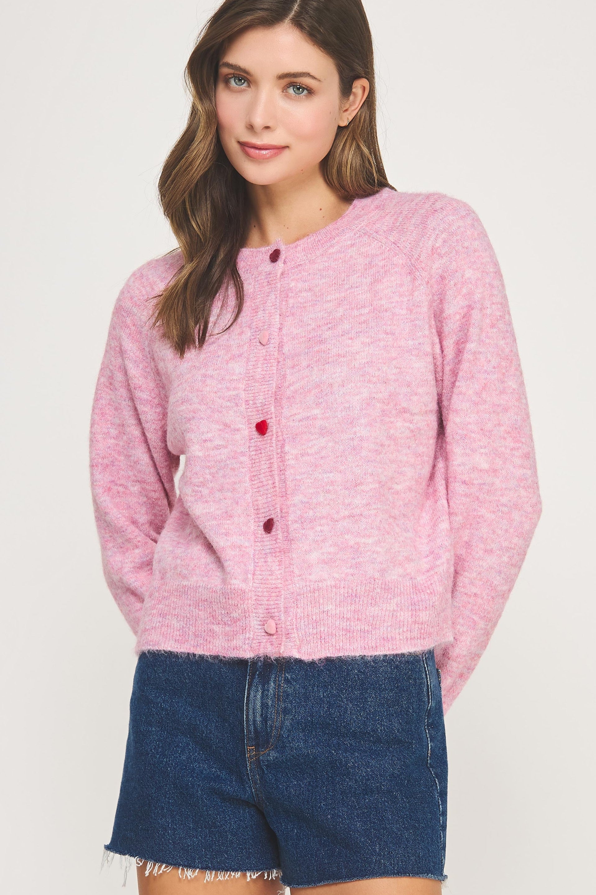 Embrace cozy charm with the Heart Button Sweater Cardigan, designed to add a touch of love to your wardrobe with Heart shaped button details. Perfect for layering on chilly days, this cardigan enhances any outfit with its flattering fit and distinctive detail, making it a staple piece you'll reach for again and again!