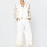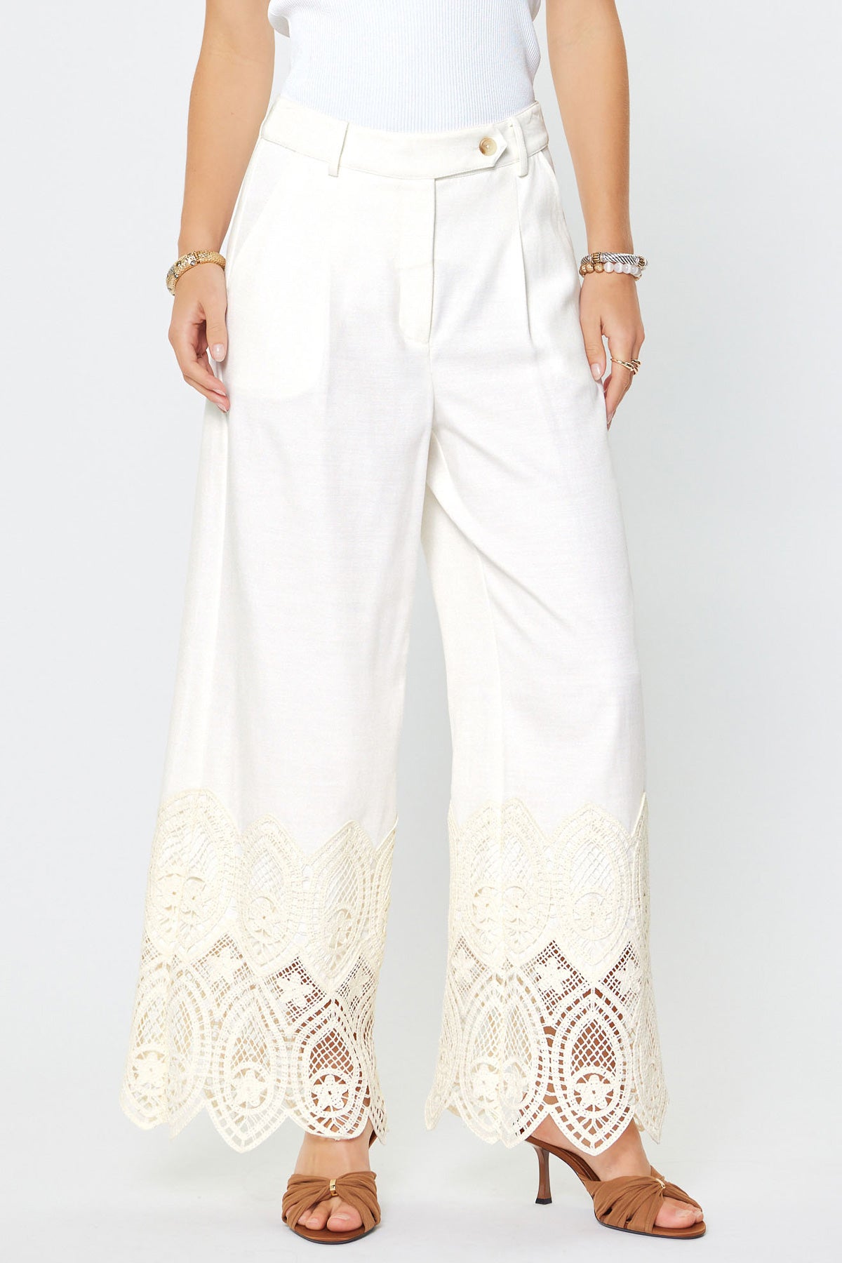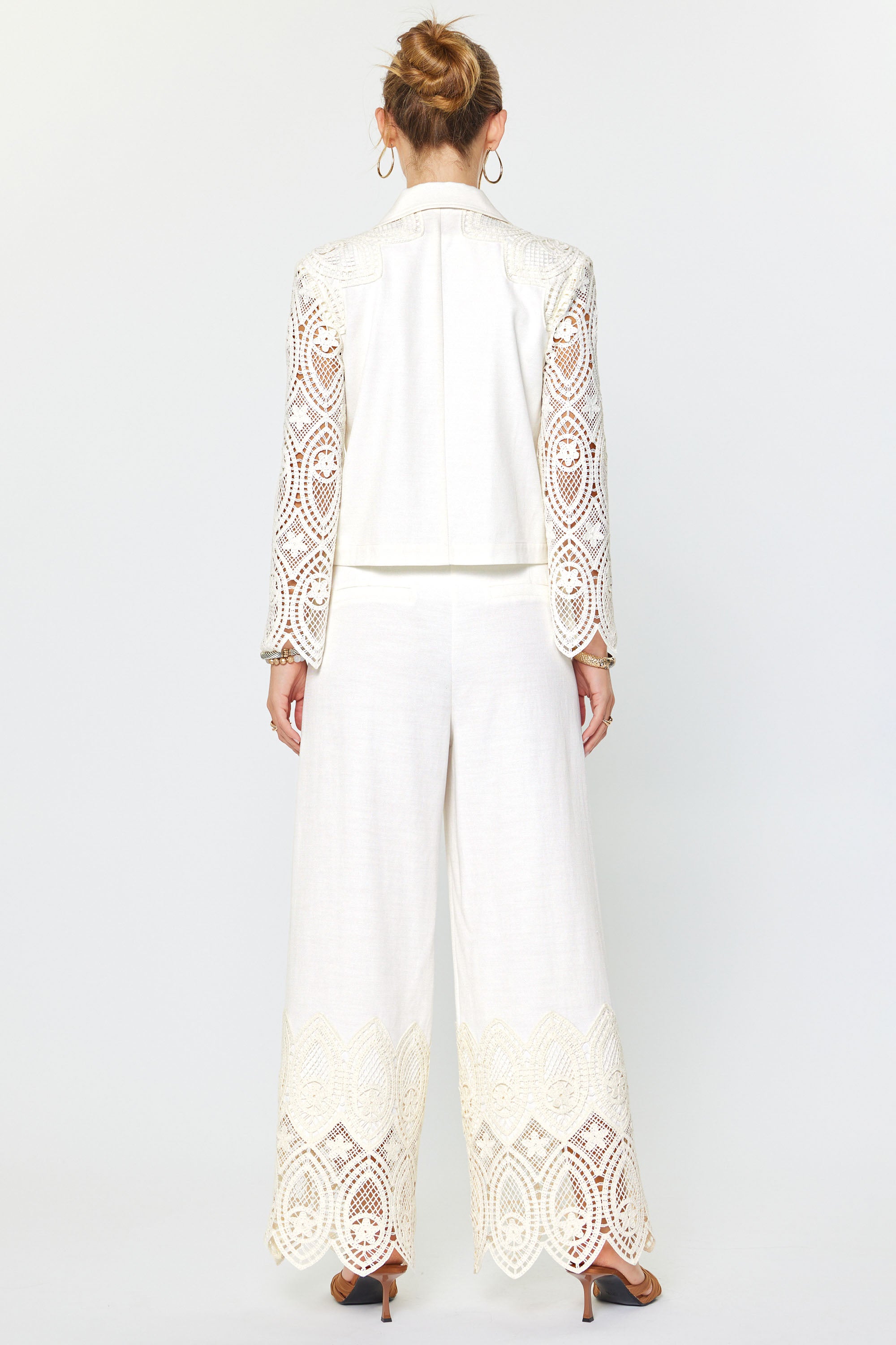 Elevate your spring wardrobe with these high-waist wide-leg pants featuring delicate crochet detailing. The flattering silhouette offers comfort and sophistication, while the intricate crochet accents add texture and visual interest. Style them solo for effortless elegance or pair with the matching jacket to create a coordinated, polished ensemble perfect for the season ahead!