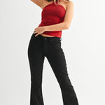 Meet your new favorite black flare. Crafted from a soft yet structured fabric, this mid-rise style offers a smooth, flattering fit through the hips and thighs with a subtle flare at the hem. A modern update on a classic silhouette, the sleek black wash makes it an effortless go-to for day or night—polished enough for work, relaxed enough for weekends!