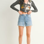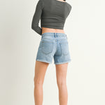 With a flattering mid-rise fit and cuffed hem, these shorts provide a casual yet polished look. The frayed edges add a touch of laid-back charm, while the stretchy fabric ensures a comfortable, flexible fit that moves with you. Ideal for warm-weather days, they pair effortlessly with everything!
