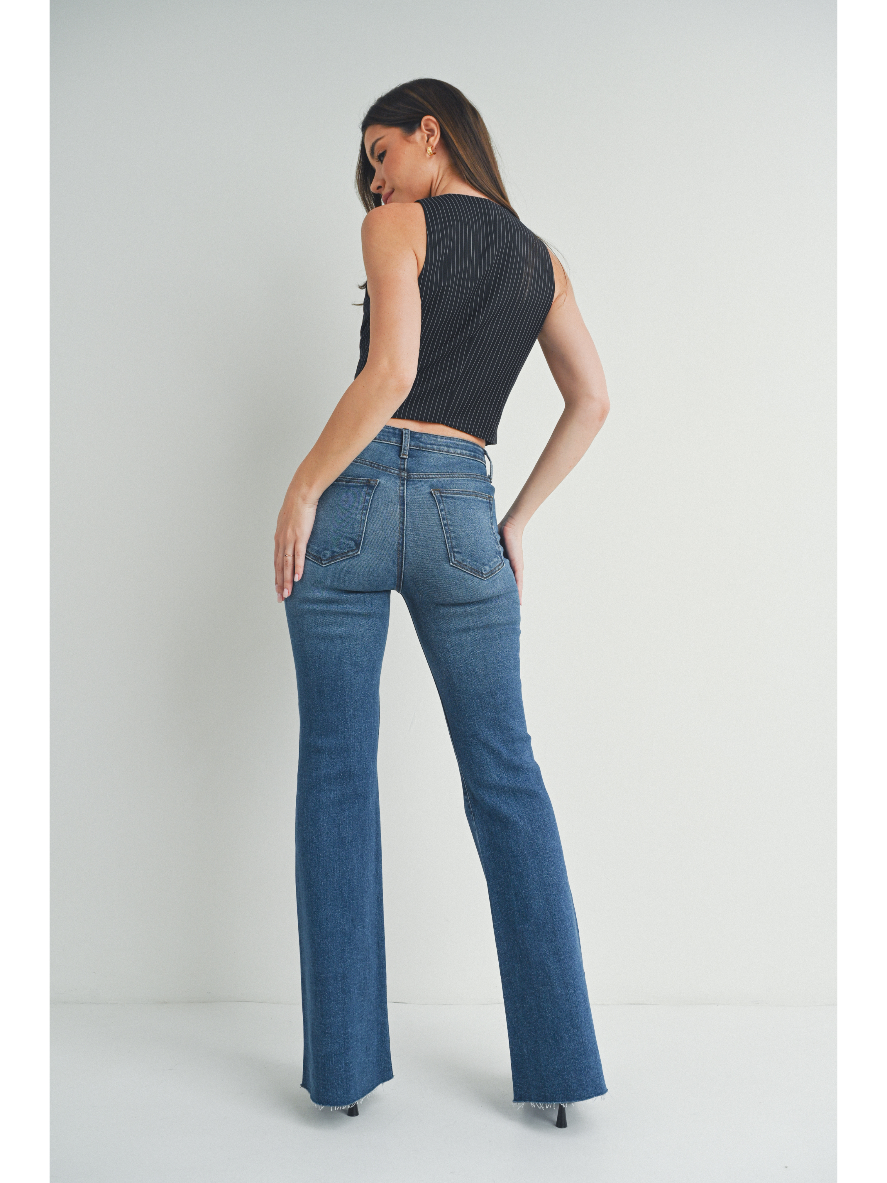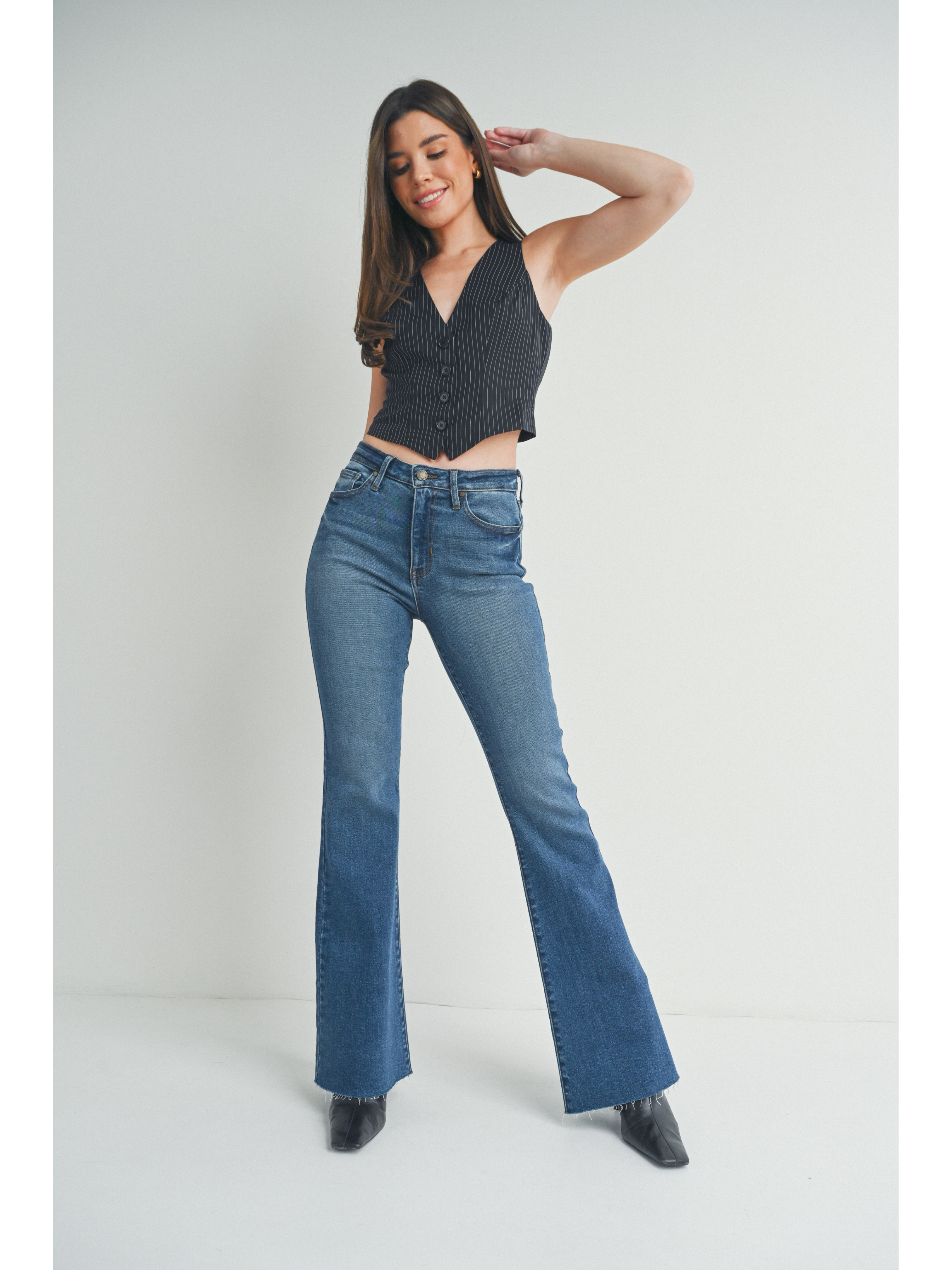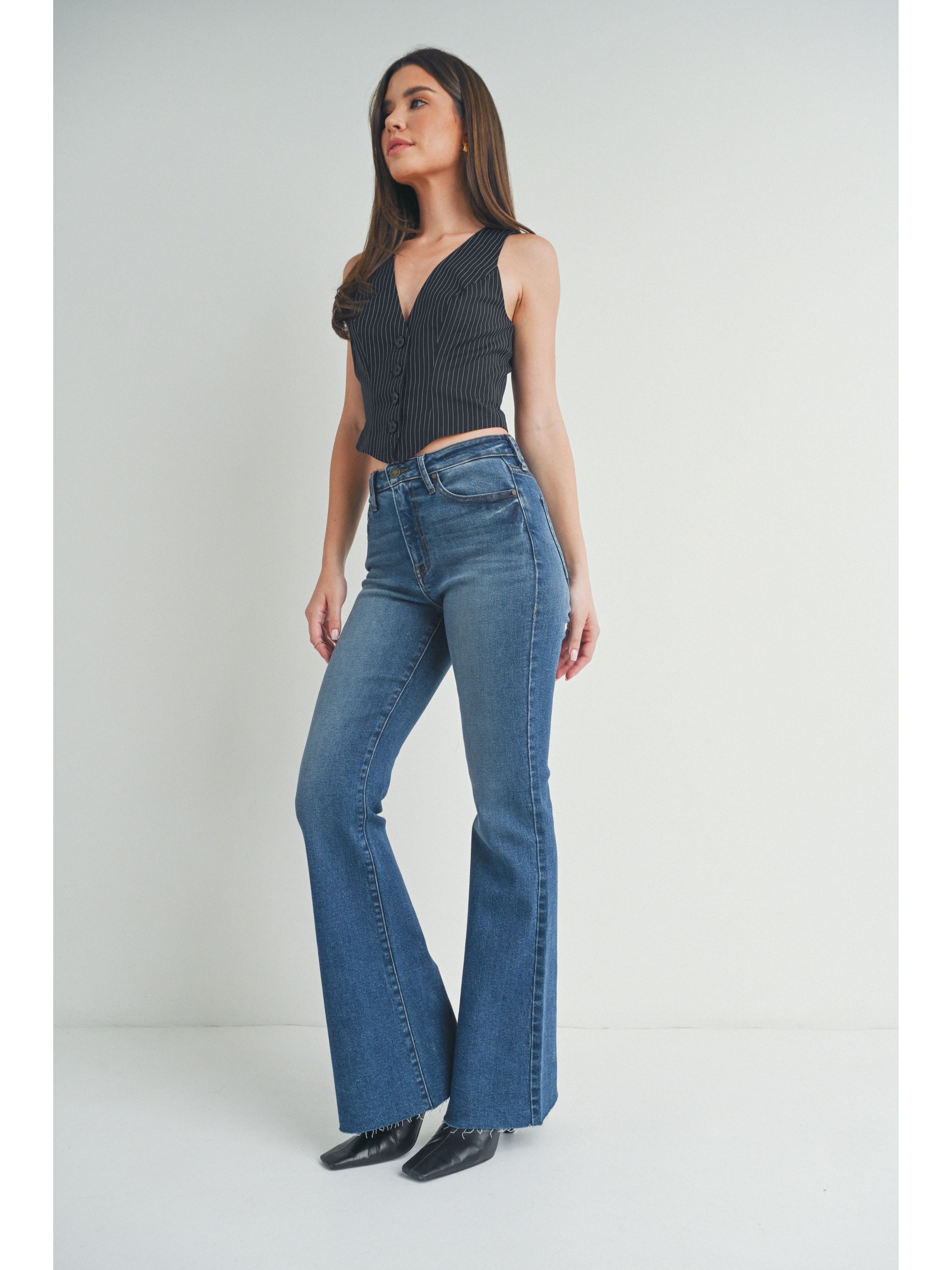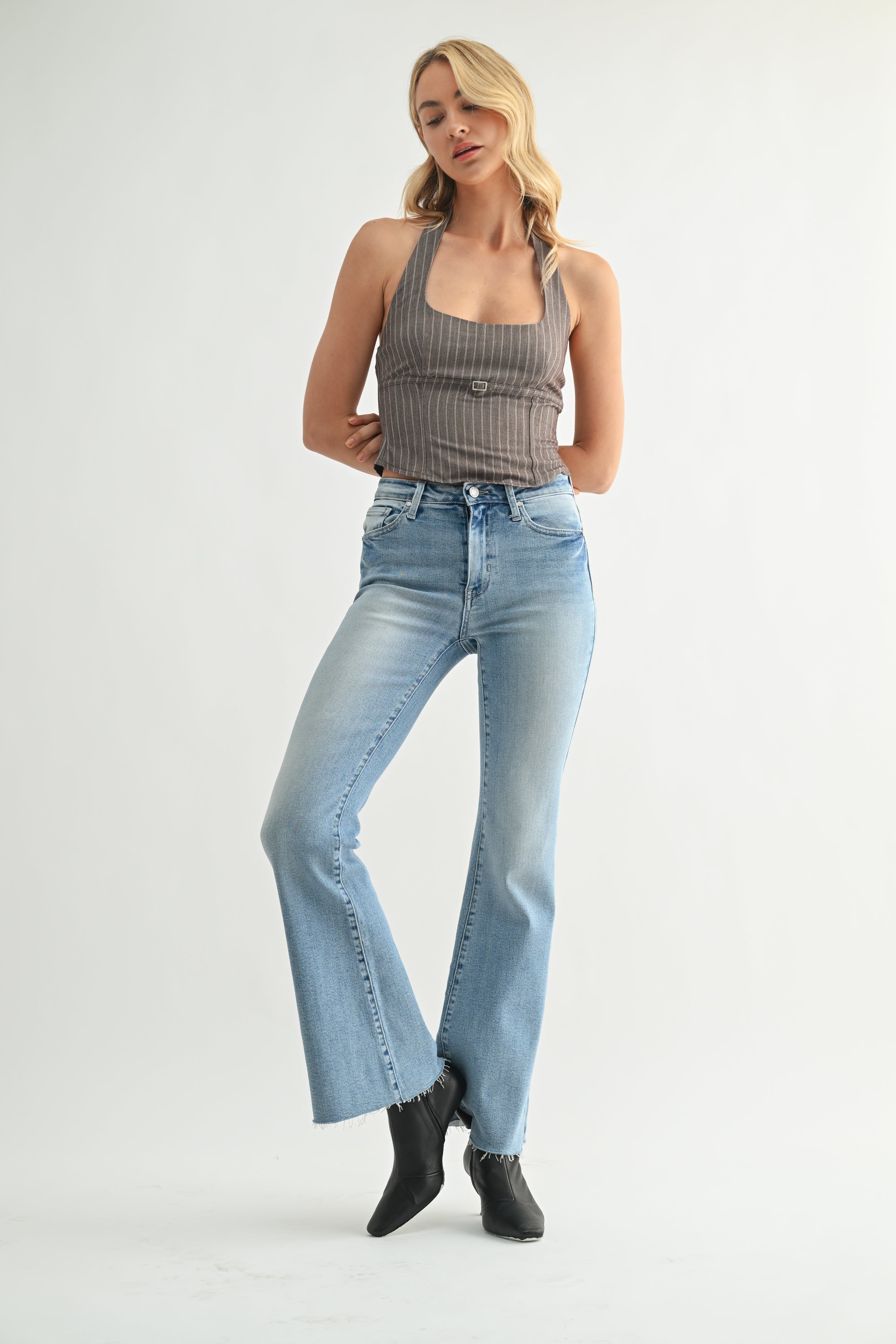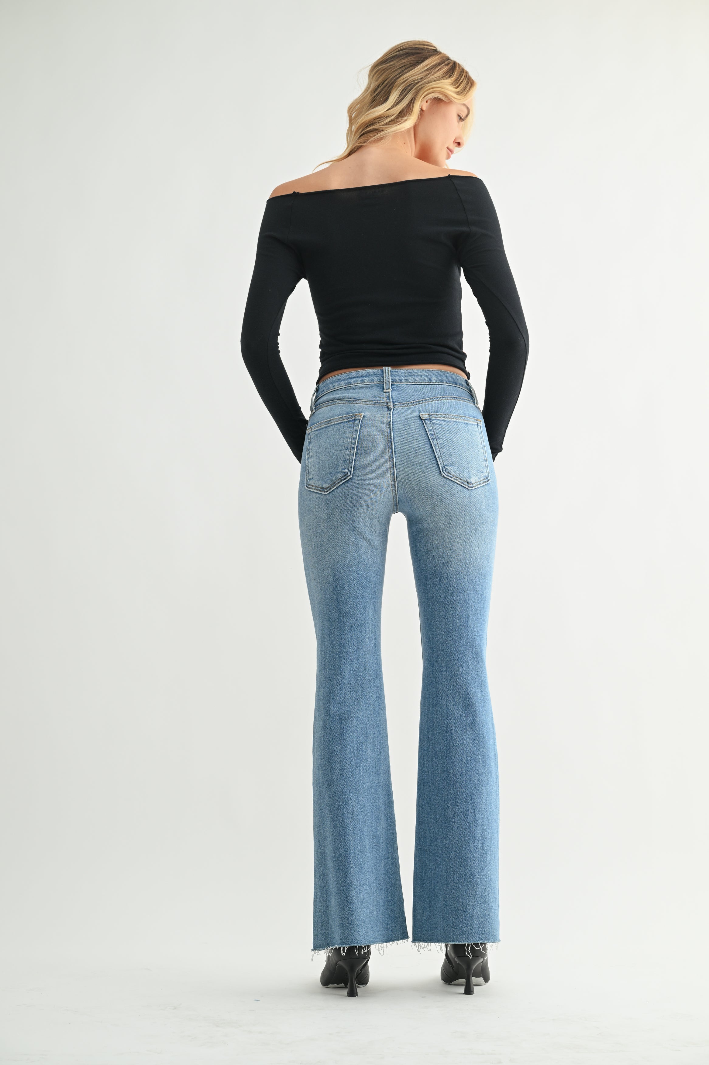 A mid-rise bootcut jean sitting right below the belly button finishing with an edgy scissor cut hem. Washed with a medium rinse that fades into a lighter color on the thighs, this pair will brighten any cowgirl's outfit. Featuring a zipper fly, five-pocket styling, and belt loops.
