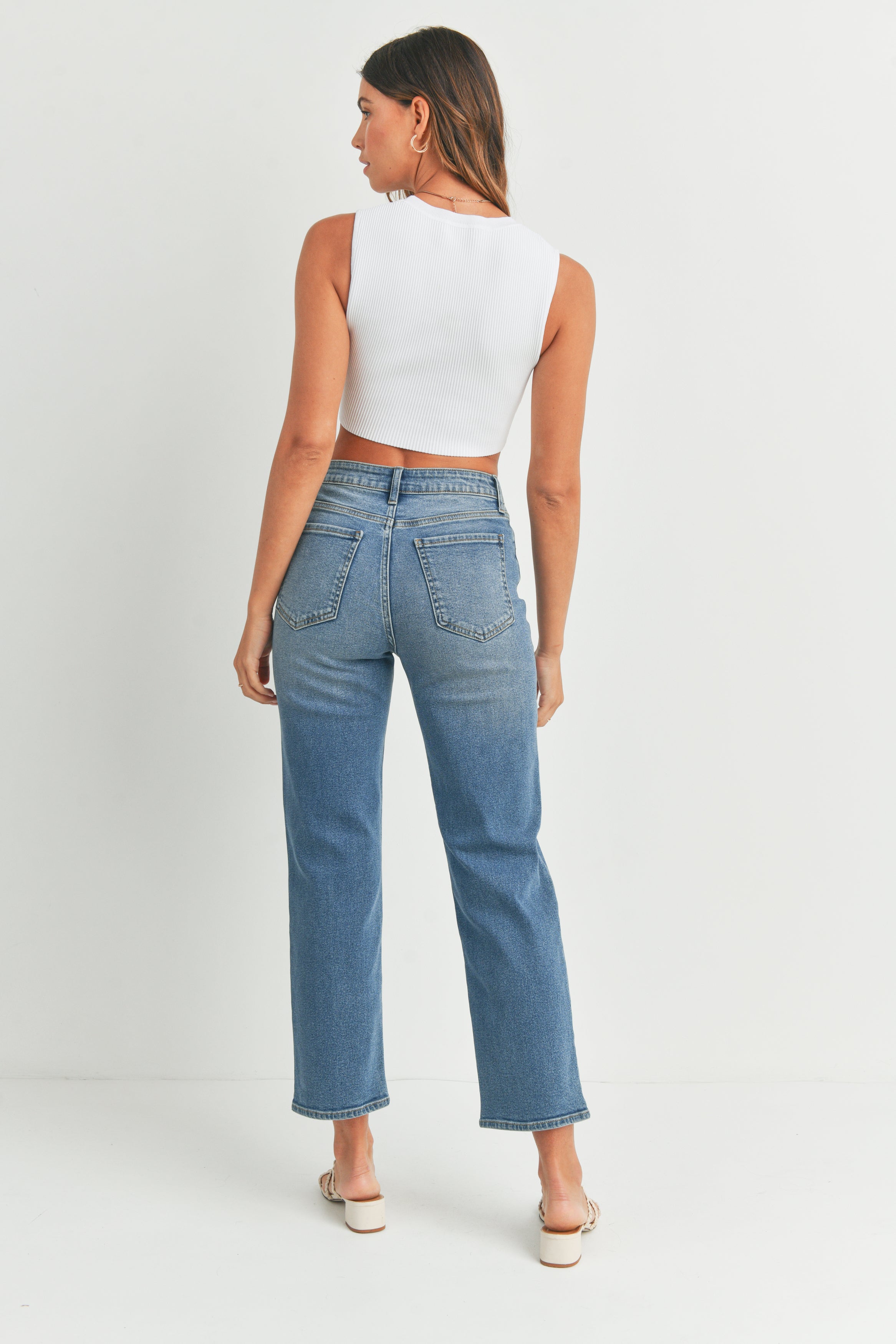 A classic straight-leg jean worthy of any era. This high-rise, ankle-cropped pair has some give through the legs and a vintage-inspired rinse for sun-drenched days and night time jam sessions!