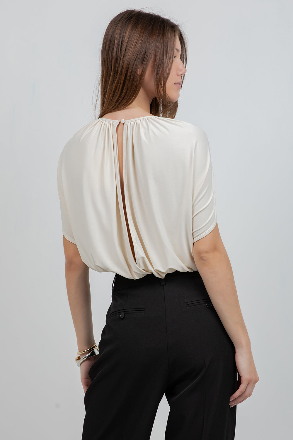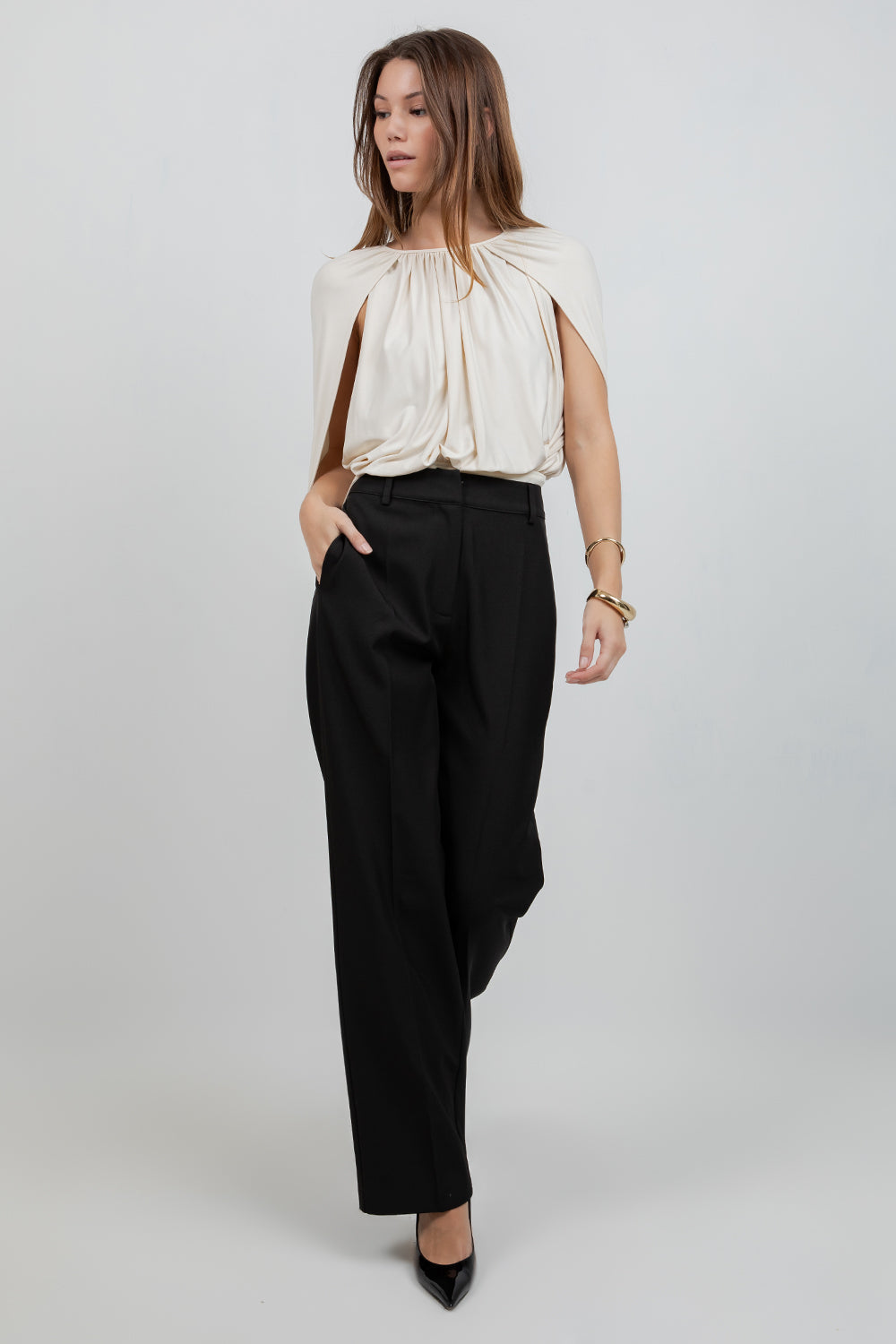 Make a bold statement with this knitted bodysuit. The sleeveless cape bodice design delivers dramatic flair and movement, while the fitted bodysuit silhouette keeps you comfortable and secure. it's the perfect piece for adding contemporary edge to any look.