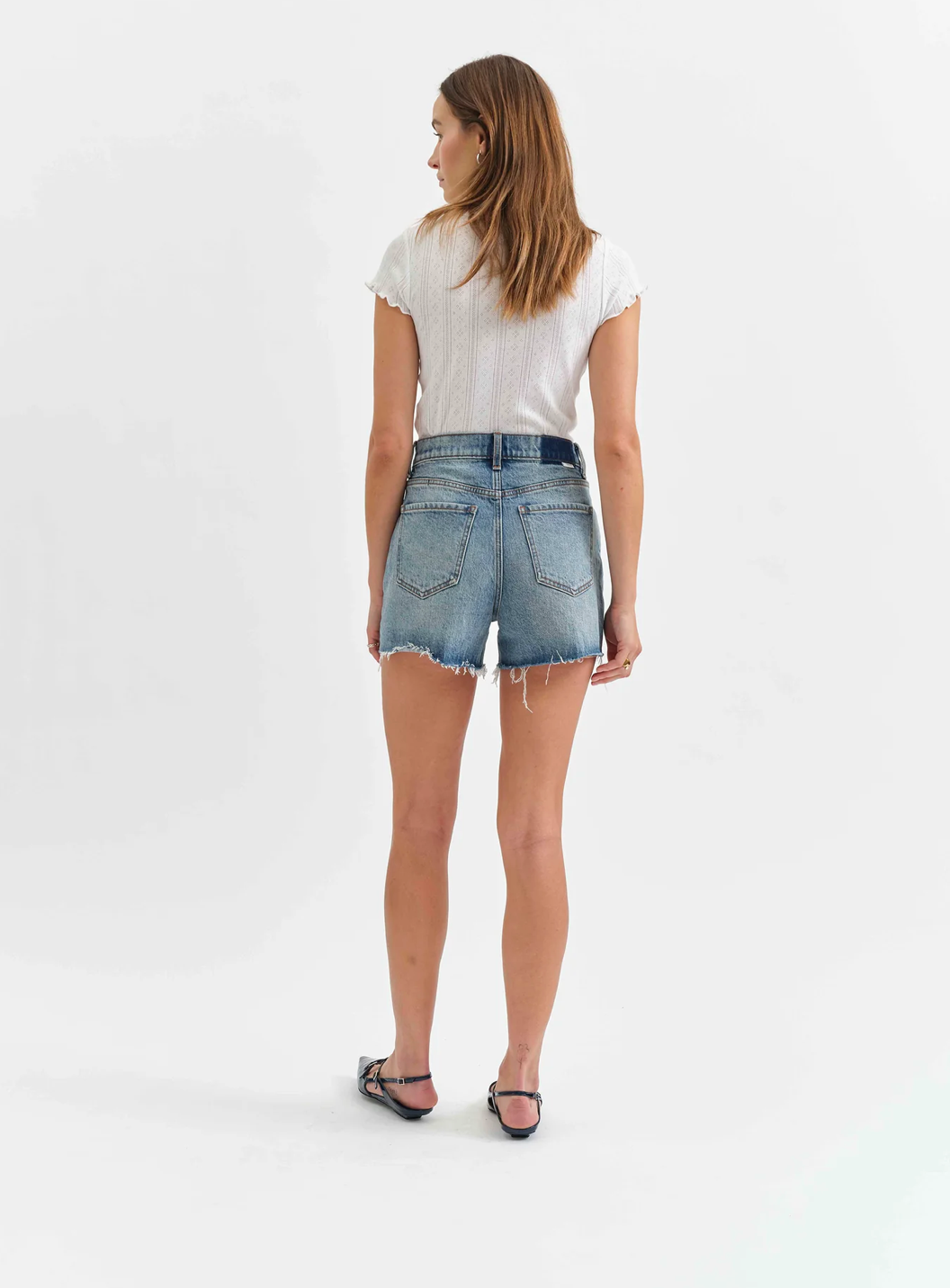 Turn heads in this high-rise a-line cutoff short, featuring scissor-cut hems against a a dark wash with vintage-inspired distressing. Constructed from our Tough Love Fabric, this short is mostly rigid but yields to your body in all the right ways.