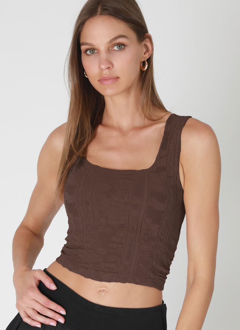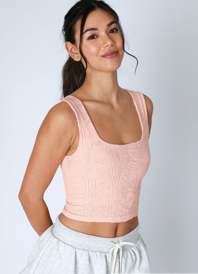 A seamless crop top featuring a square neck line and a lace textured. Designed with a double-layered construction, this top provides full coverage and is not see-through, combining sophistication with wearability. The detailing adds a feminine and romantic touch, while the tube top style is versatile and can be dressed up or down. Made from a lightweight and breathable fabric, this top is comfortable to wear all day long!