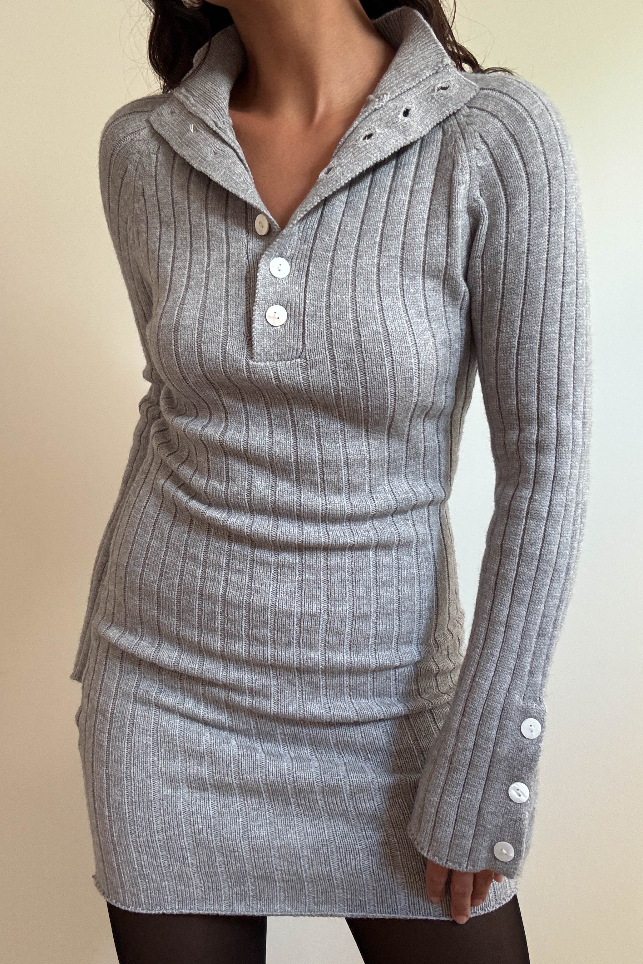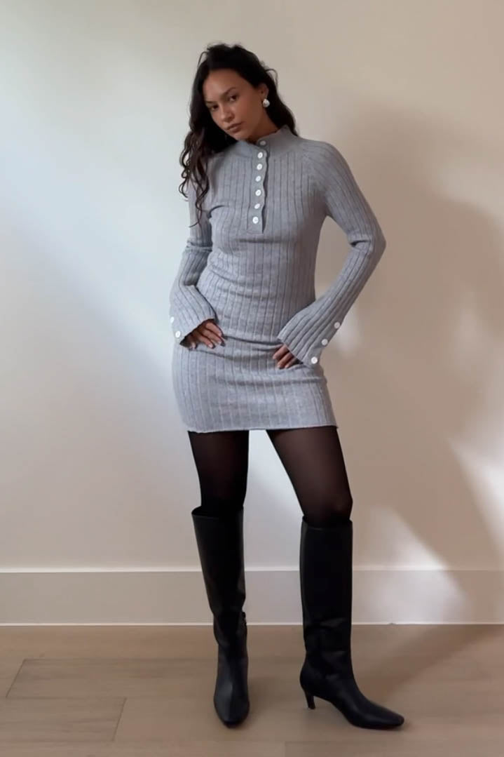 This knit mock neck long-sleeve fitted mini dress features a sophisticated center front half placket adorned with stylish buttons. The button placket at the sleeve opening adds a unique touch, making this dress a standout piece for any occasion!