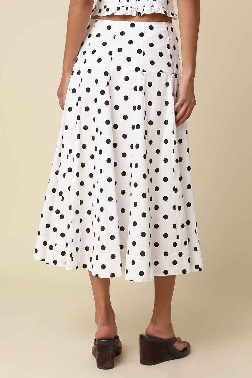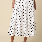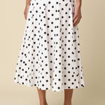 Effortless charm meets timeless style with this polka dot midi skirt. The classic dot pattern adds playful sophistication to any wardrobe. A wardrobe essential that transitions seamlessly from season to season!