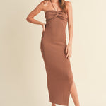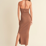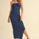 The Ruched Detail Halter Neck Long Dress is back in stock and ready to impress! Featuring elegant ruching and a stylish halter neckline, this dress enhances your silhouette with a flattering, midi length!