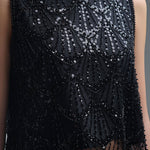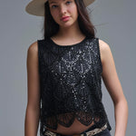 Elevate your wardrobe with this stunning black sequin top! Featuring a sleeveless cropped design and a chic crew neckline it's perfect for any occasion!