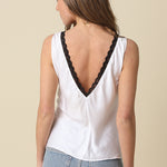 Effortless elegance meets everyday comfort in this sleeveless V-neck top. Delicate lace trim adds a touch of feminine sophistication to the neckline, creating a flattering silhouette that transitions seamlessly from day to night. The relaxed fit and breathable fabric make it perfect for layering or wearing solo during warmer months. A versatile wardrobe essential that pairs beautifully with jeans, skirts, or tailored trousers!