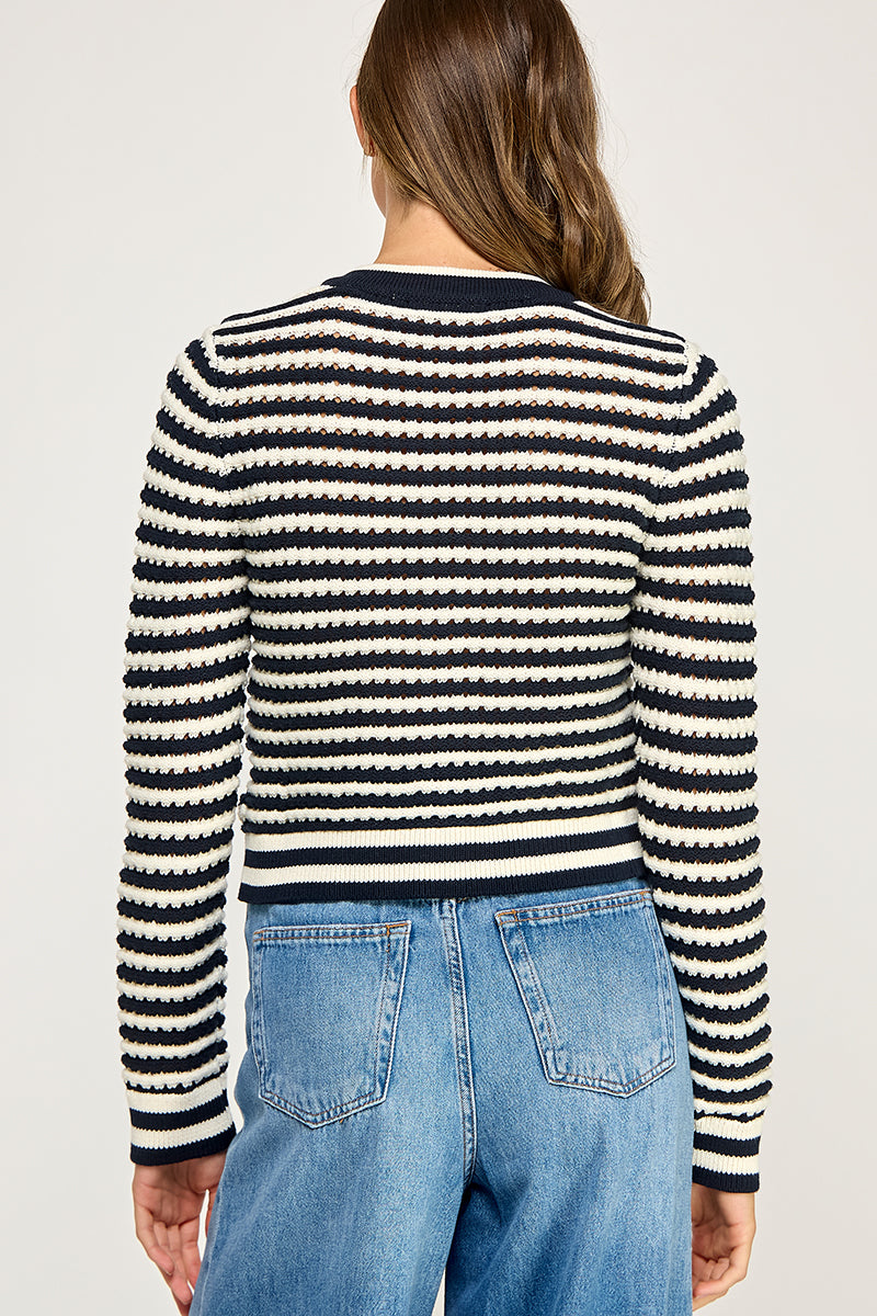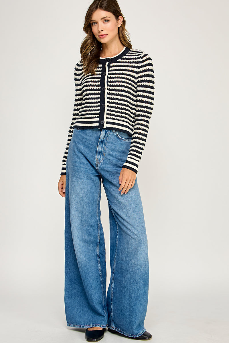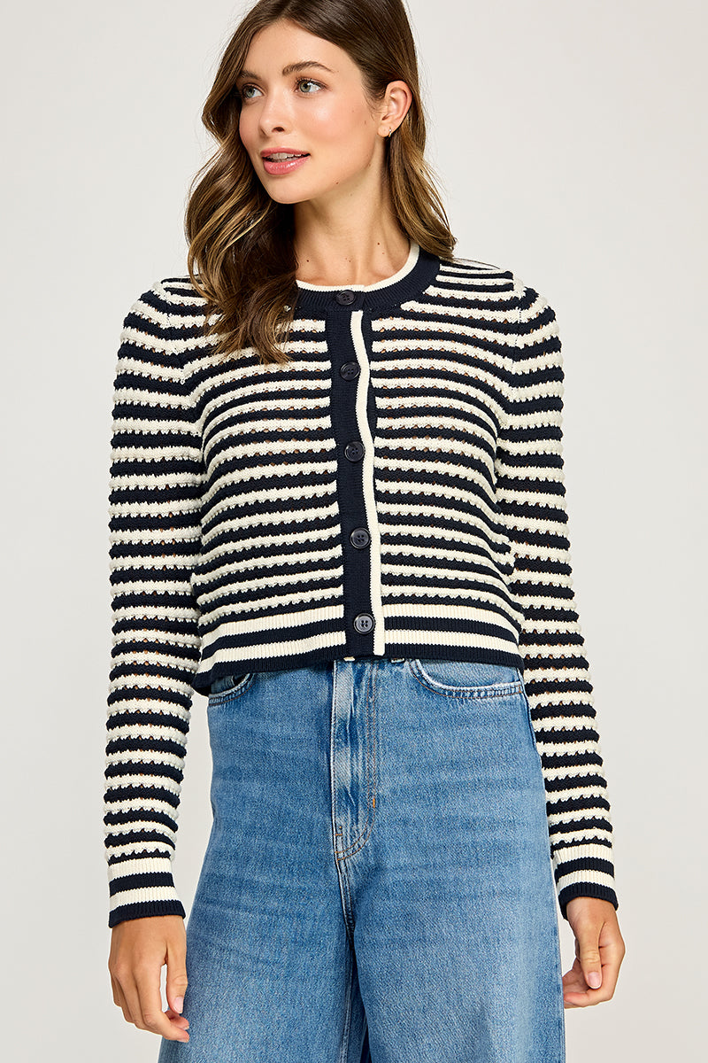 Elevate your layering with the Stripe Button Front Cardigan, designed for effortless style. Its classic button-front design and timeless stripe pattern make it an essential piece for any wardrobe. This cardigan offers versatile wear from casual days to polished evenings. Stay chic all season long with this must-have layering staple!
