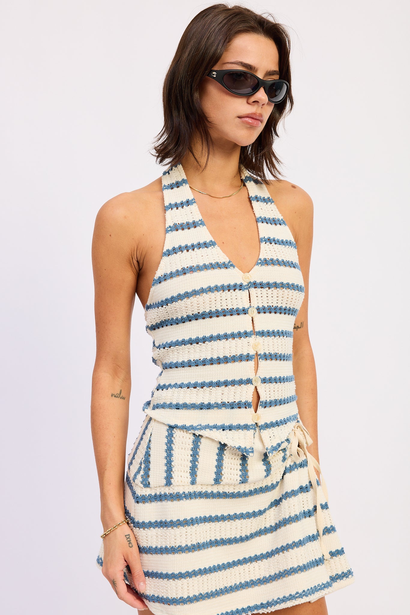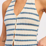Effortless vacation style starts here. This striped knit halter top delivers a flattering, breezy silhouette that transitions seamlessly from beach days to evening outings. Pair it with our matching skirt to create an instantly polished ensemble that requires zero styling effort. Lightweight and comfortable, it's the versatile piece your warm-weather wardrobe has been missing!