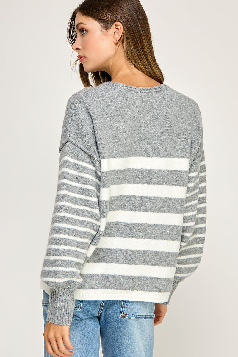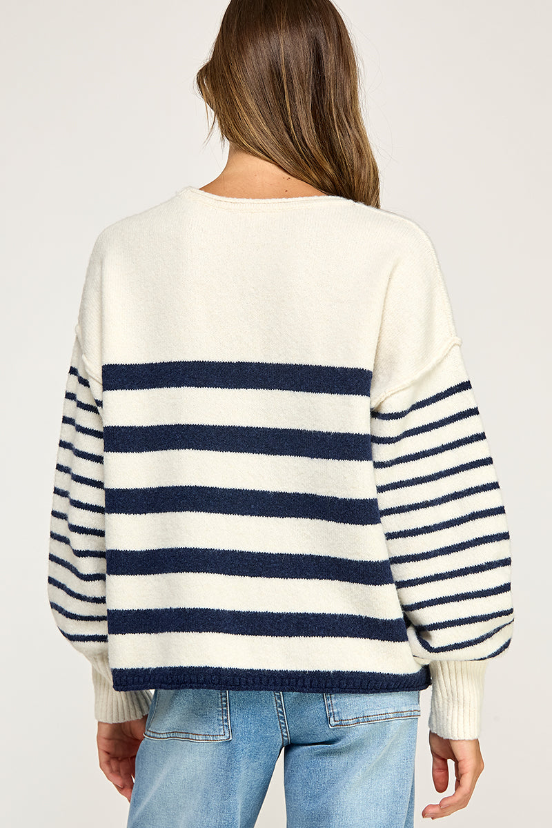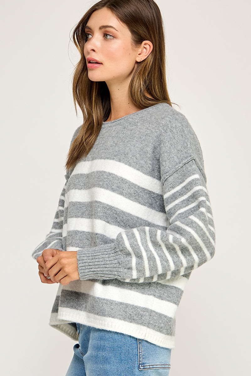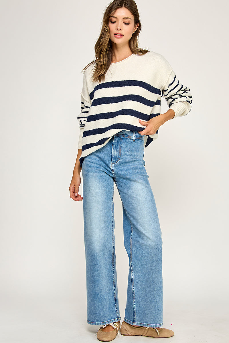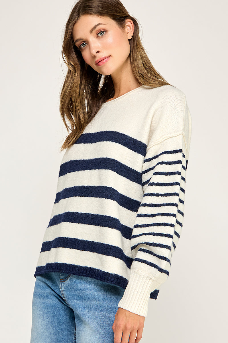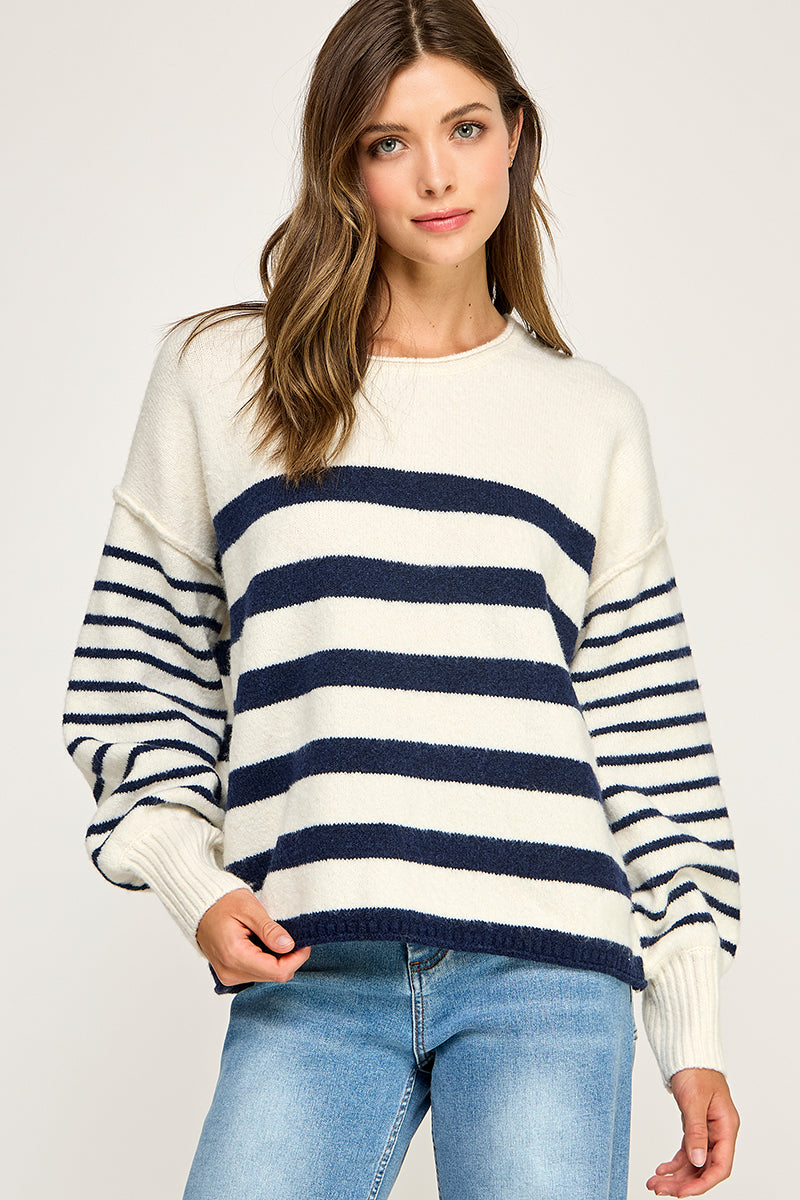Elevate your wardrobe with the Stripe Knit Sweater, offering a perfect blend of comfort and style. Crafted for a cozy fit, its classic stripe design adds timeless appeal to any outfit. Ideal for layering or wearing on its own, this sweater will enhance your everyday look with effortless charm!