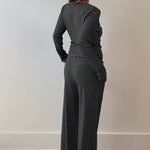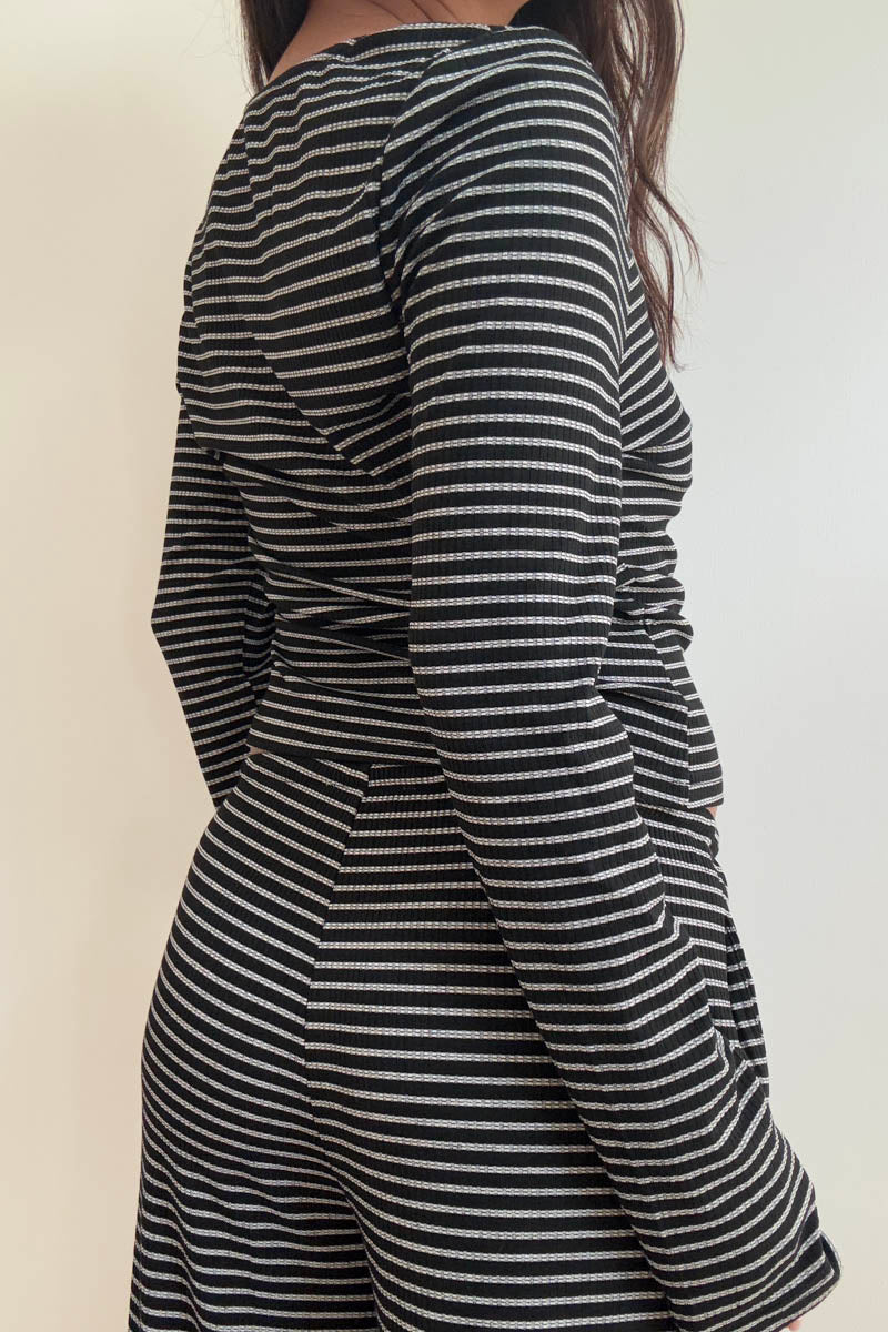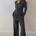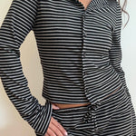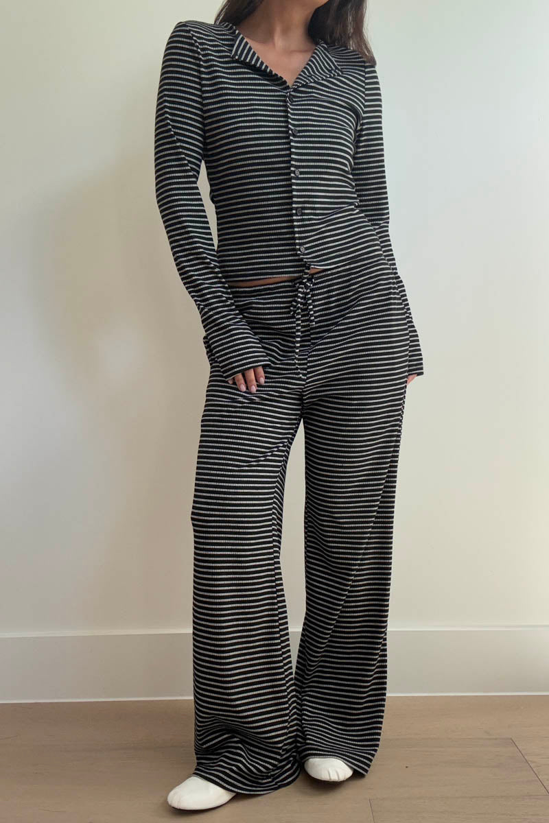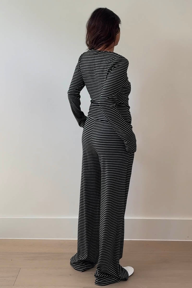 This chic ensemble features a stylish black and white striped design that effortlessly combines sophistication with comfort. The cardigan boasts a button-front closure and long sleeves. The mid-waist pants are designed with an elastic waistband, a self-tie waist, and a wide straight leg.