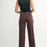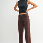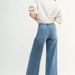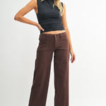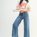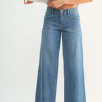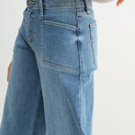 Low rise utility jeans with a slim fit, transitioning into a dramatic wide leg with utility pockets for a modern, comfortable, trendy vibe.