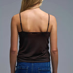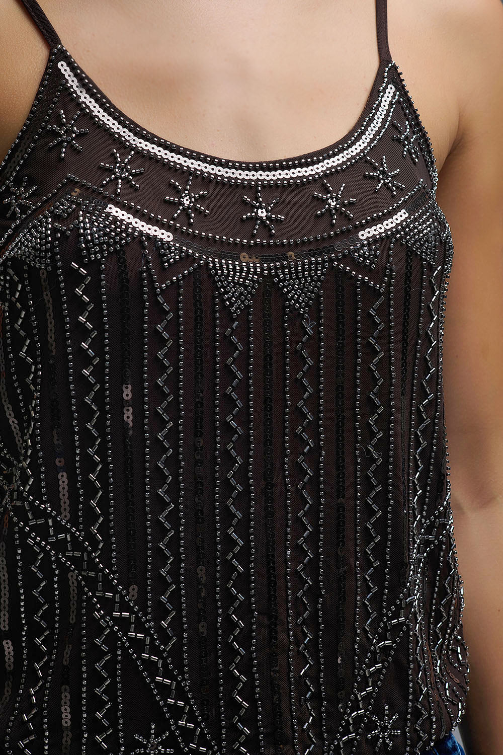 Upgrade your wardrobe with this fabulous brown sleeveless cami top that’s sure to turn heads! It features bright sequins that shimmer in the light adding just the right amount of glam to any outfit. Plus the cute mini sun embroidery gives it a unique artistic touch making it truly special. Made from lightweight chiffon it feels great against your skin and moves beautifully combining comfort with style. Whether you're headed out for a fun night or celebrating a special occasion this vintage-inspired top will definitely be a conversation starter and keep you looking fabulous!