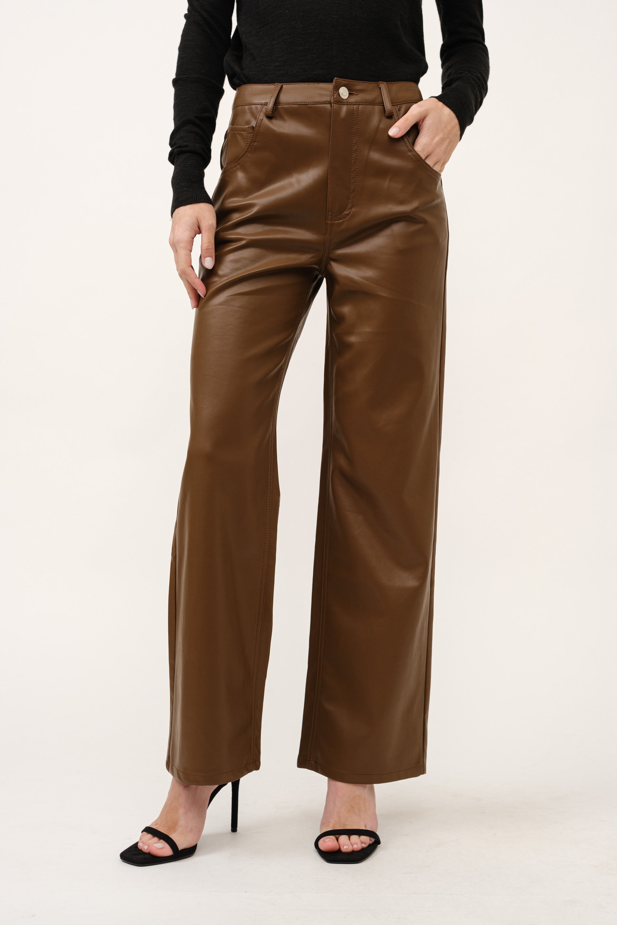 Elevate your style with our Wide Leg Leather Pants. These pants offer a luxurious feel and a sleek finish. The wide leg design adds a touch of sophistication, while the adjustable waist ensures a comfortable fit. Own your style and make a statement with these pants!